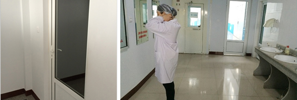进入第二道门——密码门时需要输入公司密码器设定的密码方能进入车间,以保护车间生产的安全、卫生性;同时,入门后必须按照公司制度规定,更换专用鞋或是无尘鞋、工作服以及工作帽,以防止人员进入车间时,将外部灰尘、垃圾等带入,保证产品卫生干净。